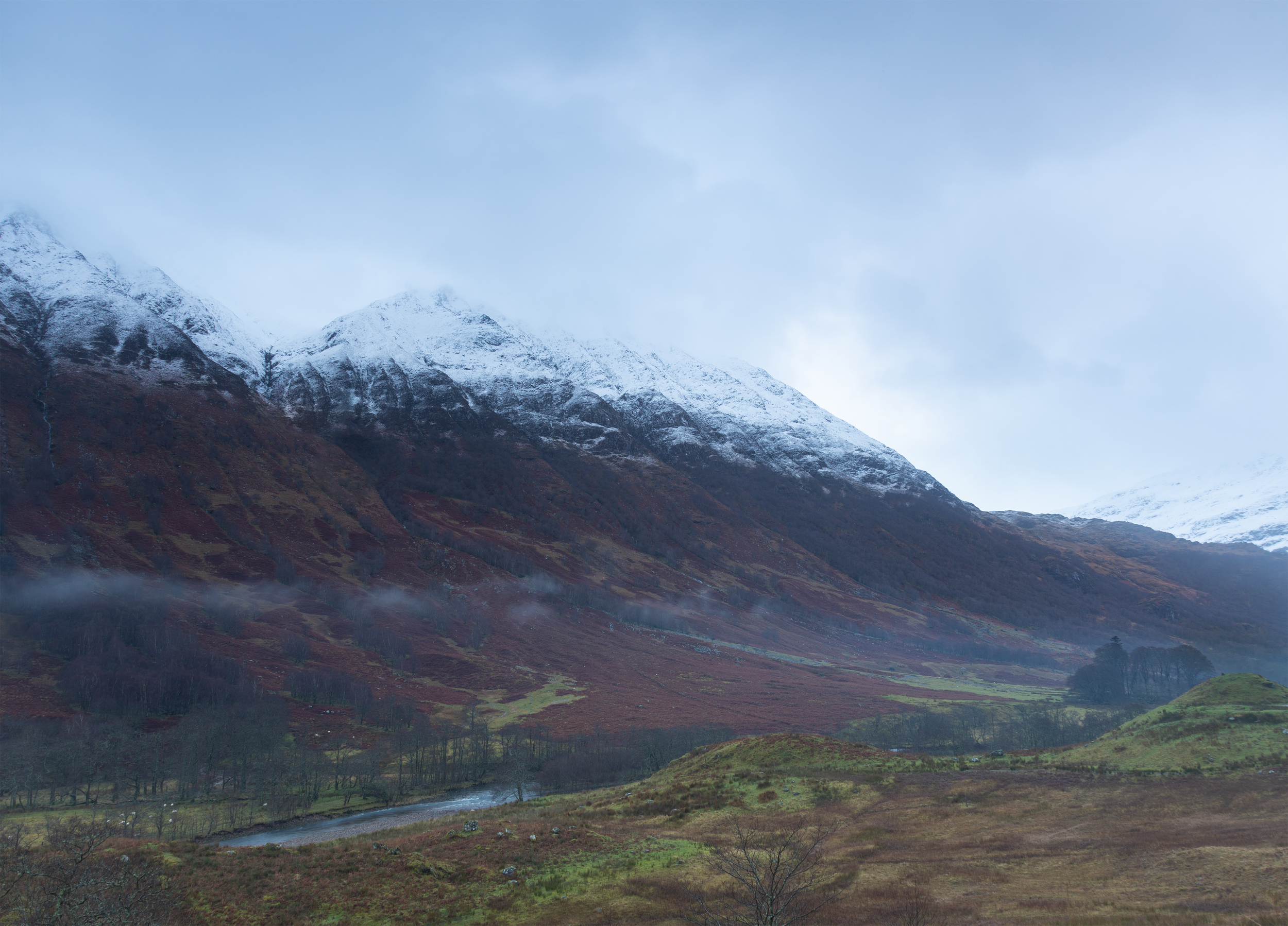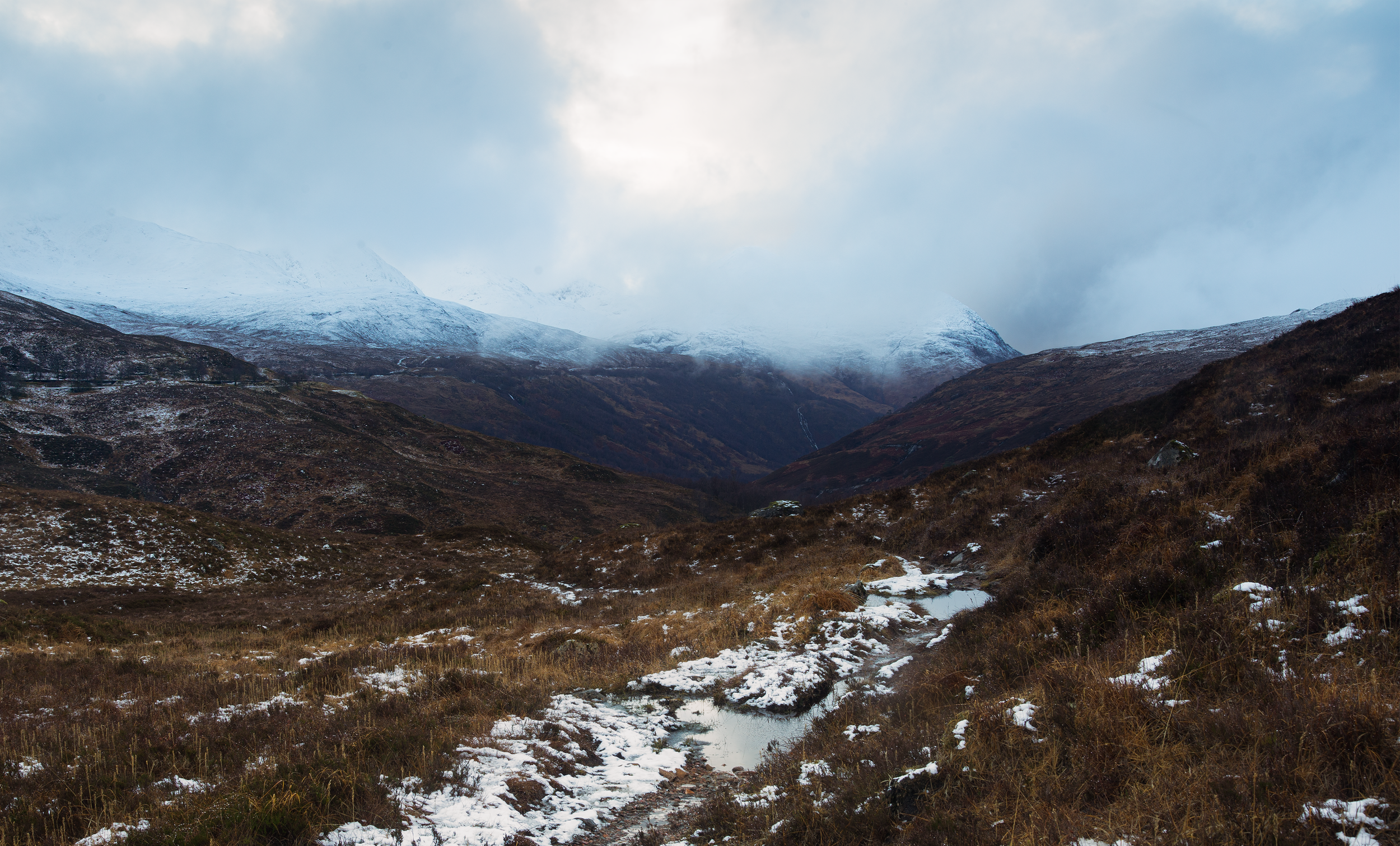 The first issue I faced was travelling from my Uni house in Birmingham up to Glencoe, which ended being an 8-hour drive which left me drained for the first day of the trip. Even so, day 1 was still a success. We decided to follow a hike through the mountains surrounding the town of Kinlochleven. Walking through the silent snow-capped mountains made me appreciate the scale and age of the highlands. I captured a few images with longer exposures, which helped paint the peace and serenity I experienced.